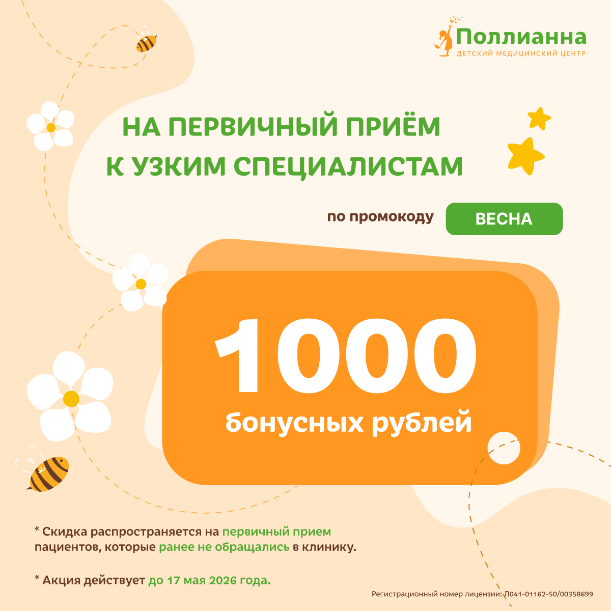 Детский медицинский центр «Поллианна» дарит 1000 бонусных рублей на первичный приём к узким специалистам по промокоду ВЕСНА. Отличная возможность пройти консультацию с выгодой. Акция действует до 17.05.2026.